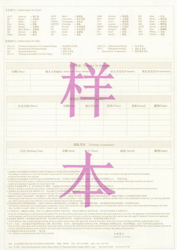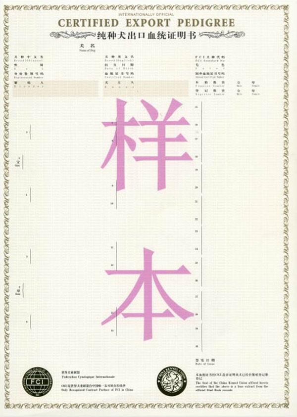 CKU纯种犬出口血统证书样本!!