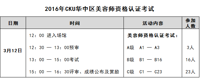 2016年CKU华中区美容师资格考试时间安排(3月长沙)