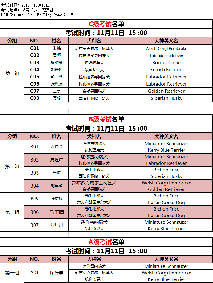 1. 考生请于考试前,凭CKU会员卡及有效身份证件领取考试用号码袖标。 2. 考生需穿着正装参加考试,号码袖标佩戴于左臂。 3. 考生需自备考试所用犬只,报名截止后不可更改犬种。 4. 考试期间考生不可与审查员及其助理攀谈交涉。 5. 考生须无条件服从审查员审查结果。 现场联系方式:王婷 13601175621 刘曦18515835756
