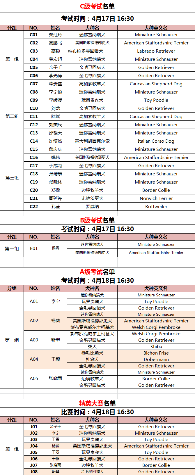 注意事项: 1. 考生请于考试前,凭CKU会员卡及有效身份证件领取考试用号码袖标。 2. 考生需穿着正装参加考试,号码袖标佩戴于左臂。 3. 考生需自备考试所用犬只,报名截止后不可更改犬种。 4. 考试期间考生不可与审查员及其助理攀谈交涉。 5. 考生须无条件服从审查员审查结果。 现场联系方式:王婷13601175621