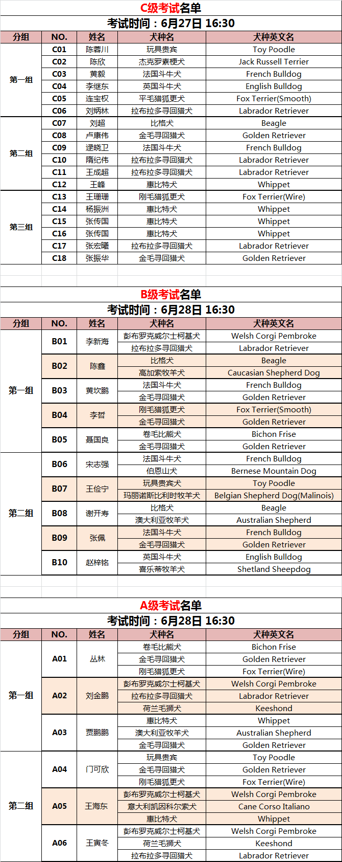注意事项: 1. 考生请于考试前,凭CKU会员卡及有效身份证件领取考试用号码袖标。 2. 考生需穿着正装参加考试,号码袖标佩戴于左臂。 3. 考生需自备考试所用犬只,报名截止后不可更改犬种。 4. 考试期间考生不可与审查员及其助理攀谈交涉。 5. 考生须无条件服从审查员审查结果。 现场联系方式:王婷 13601175621