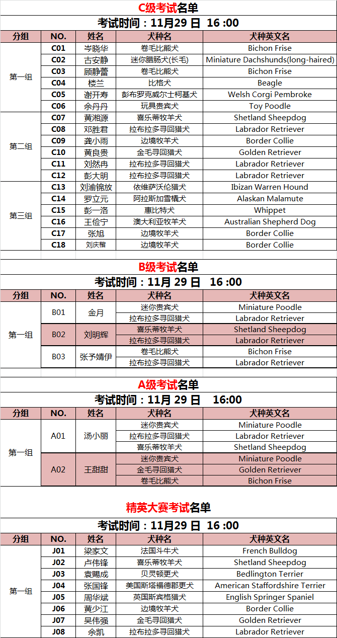 1. 考生请于考试前,凭CKU会员卡及有效身份证件领取考试用号码袖标。 2. 考生需穿着正装参加考试,号码袖标佩戴于左臂。 3. 考生需自备考试所用犬只,报名截止后不可更改犬种。 4. 考试期间考生不可与审查员及其助理攀谈交涉。 5. 考生须无条件服从审查员审查结果。 现场联系方式:王婷 13601175621
